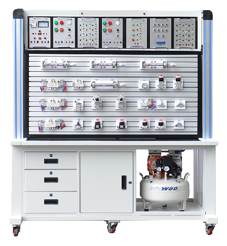 本實訓裝備,由氣動元件部分、電氣控制部分及實訓臺架等組成,電氣部分主要由PLC模塊、繼電器模塊、電源模塊、按鈕模塊等部分組成。實訓臺主體框架采用鋁木結構組裝完成,臺架重量較輕且安裝了萬向輪,可方便實訓臺的移動。臺架分上下兩層結構,上面可放置電氣模塊,下面是實訓屏,實訓屏采用帶槽鋁合金結構,方便各氣動元件的安裝和拆卸,學生可以根據實驗需要在實訓屏上任意搭建氣動回路,組成具有一定功能的氣動系統(tǒng)。實訓臺采用模塊式結構,便于組合與擴展,提高了設備空間的利用率。
