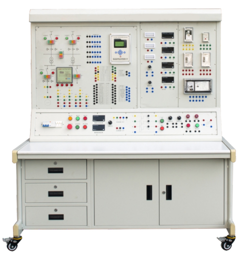 本裝置由實驗臺,實驗桌、實驗模塊、大功率三相自耦調壓器四部份組成。本裝置的實驗臺左側有10kV/0.4KV一次系統主接線面板,實驗臺右側為實驗模塊掛放區、實驗臺下側為電源實驗臺。
