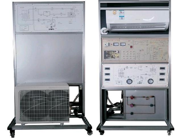 2.、裝置直觀展示了空調的系統結構和工作原理,便于教學演示講解及學生對課本知識的理解掌握。配置的交流電壓表、交流電流表、溫度表、真空壓力表以及相應的信號指示燈,使整個變頻空調系統的實時工作狀態一目了然;主面板中間印有電氣控制系統原理圖,并設有相應測試點;,屏背面可觀察到整個制冷系統結構原理以及主要部件的實際物體,相應部件均有名稱標識;并設有視液鏡,可觀察制冷劑狀態