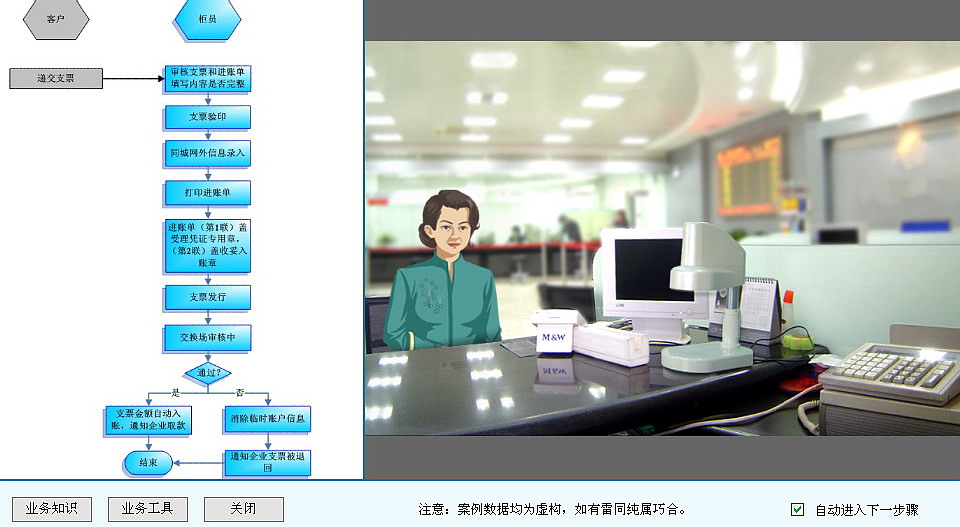 學生在經過基礎的實務課程學習后,將被置于一個完全仿真的現代商業銀行的工作環境中,面對銀行每日的工作開始進行模擬實操。學生們將會面對虛擬的客戶提出的各種要求來進行相應的處理。對于學生來講,實操過程中的所有操作都是自由的,他們需要通過完全自主的思考來判斷下一步的操作。譬如客戶提出的支票轉帳請求是否受理?如果不受理理由是什么?(譬如涉及支票的鑒別、簽章的鑒別等)接受以后如何操作?同時模擬系統根據內置的業務邏輯自動判斷學生操作的正確性,對其業務能力進行實時的評價和記錄,并且將結果及時反饋給學生。通過每一步操作的自主思考和系統不斷的提示加強學生對于業務處理的理解,幫助其提高業務操作的熟練程度,并且培養其判斷分析能力。實操訓練的內容完全參照日常銀行業務操作所涉及的范圍,同時也可以根據實驗課程主題的要求進行具體的靈活配置。