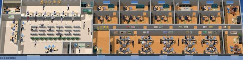 LG-RCJ03A 現代商業銀行模擬教學平臺對于現代商業銀行的工作環境進行全面仿真,包括營業大廳的布局,對公對私的工作臺、貸款管理部門的辦公室等全3d的建筑仿真;工作人員日常業務使用的綜合業務系統等核心業務軟件和各種業務單據;簽章、電腦、打印機、點鈔機、票箱、打碼機、壓數機等辦公設備。并且在模擬實操中讓學生來熟悉和使用。