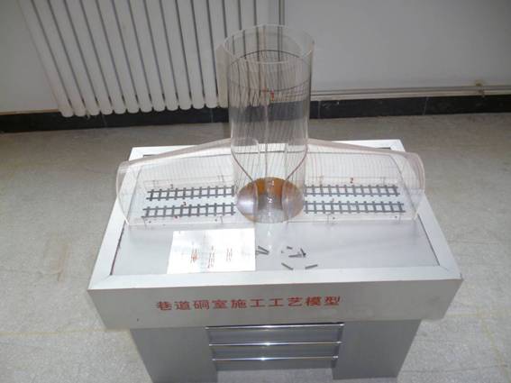 LG-MXD01型 巷道峒室施工工藝模型采用有機玻璃、電腦雕刻,并利用模型和發光管顯示了巷道峒室施工生產系統、施工順序、主要設備設施。模型有風鎬、臺鉆、轉載機、皮帶機、雙風機雙電源、瓦斯報警斷電裝置、灑水水幕、隔爆水槽棚支護材料及形式等。