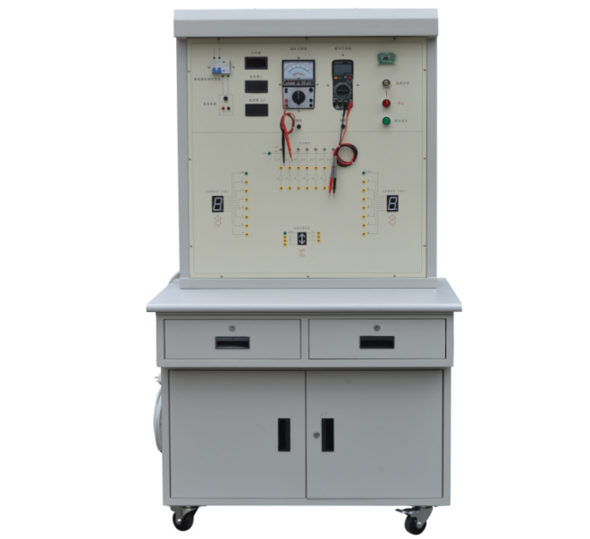 (1)實訓臺主體部分采用全鋼結構,鋼板亞光噴塑,美觀耐用,臺面采用鋁塑板印制而成,整個實訓臺由漏電保護開關、熔斷器、開關電源、數顯計時器、智能刷卡啟動電路板、七段數碼管(共陰)、七段數碼管(共陽)、方向數碼管、交流接觸器、數字電壓表、數字電流表、指針萬用表、數字萬用表、照明日光燈、帶鎖開關、按鈕開關、鈕子開關、電阻器和安全接線柱等組成。