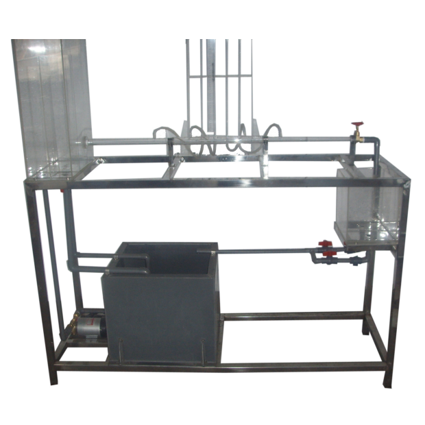 有機玻璃實驗水箱、局部阻力管、測壓管、水泵、蓄水箱、計量水箱、刻度標尺、秒表、玻璃溫度計、自循環裝置、閥門、不銹鋼框架。