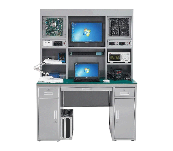 1、實訓裝置可分層擺放顯示器、示波器、熱風槍、恒溫焊臺、穩壓電源、萬用表、放大鏡臺燈、維修常用工具及元器件和備品。