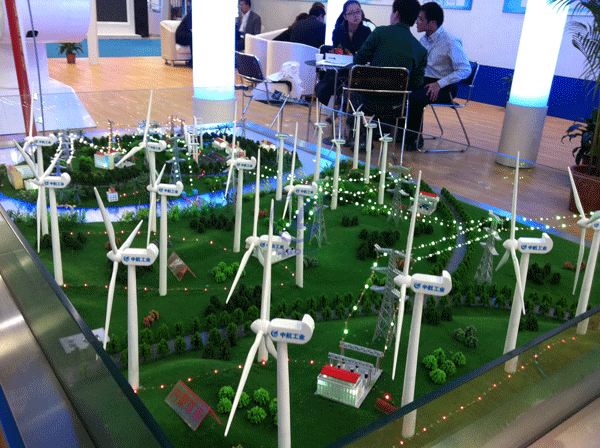 風電場模擬動態沙盤:大型風電場布局比例設計;模型整體布局為沙盤式,沙盤上布局20個小型風力發電機模型,各風機布局為錯開式布置。風機電動演示,設置升壓站,輸電鐵塔、辦公樓等設施風機、升壓站、輸電線路、場區環境,風機電動演示;