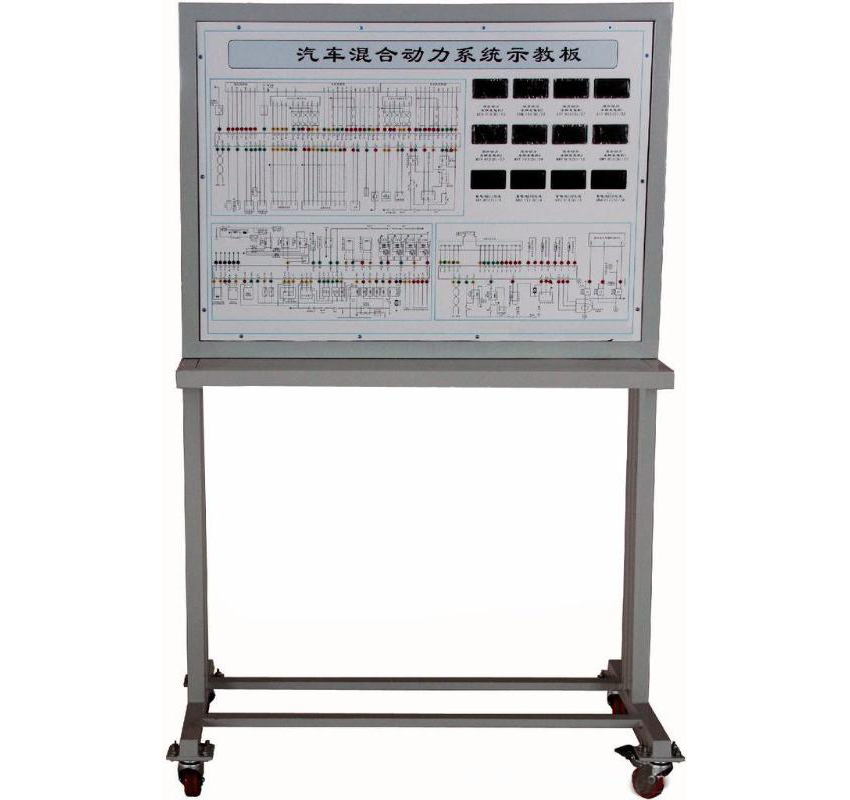 點火開關、混合動力原理圖、模擬裝置的直流電動機、發光二極管組件、制動開關等。12V開關電源、大型彩色噴繪電路原理圖、控制面板、可移動臺架、使用說明書及實訓指導書等。