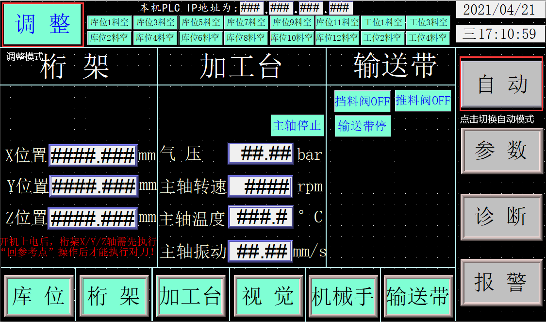 7.設(shè)備運(yùn)行狀態(tài)監(jiān)測(cè):網(wǎng)關(guān)實(shí)時(shí)讀取堆垛機(jī)、加工臺(tái)、機(jī)械手、傳送帶等設(shè)備的運(yùn)行狀態(tài)及加工主軸的轉(zhuǎn)速、溫度、振動(dòng),氣缸壓力等參數(shù),并顯示,同時(shí)上傳到平臺(tái)。