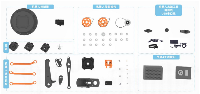 實驗箱包含由機器人控制器、機器人驅(qū)動電機、機械限位開關(guān)、機器人結(jié)構(gòu)件及機器人末端工具。