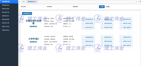 課程大綱管理模塊針對每一門課程,詳細的定義了課程的詳細內容,包括基本信息,授課教師,教學目標,教學單元,教學方式,評價方式等等。