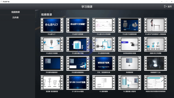 (3)微課學習包括視頻學習和元件庫兩個部分,視頻學習包括PLC相關的學習視頻20個,元件庫包括PLC相關的電氣元件的三維模型。三維模型總數不少于20個。