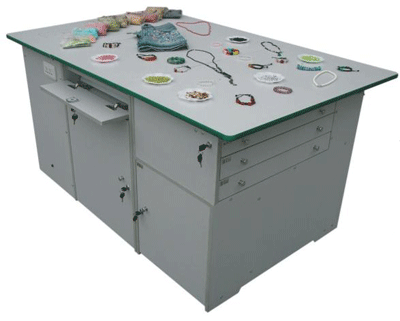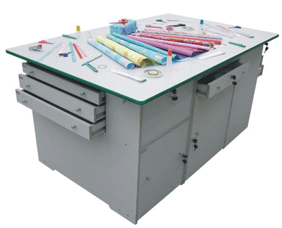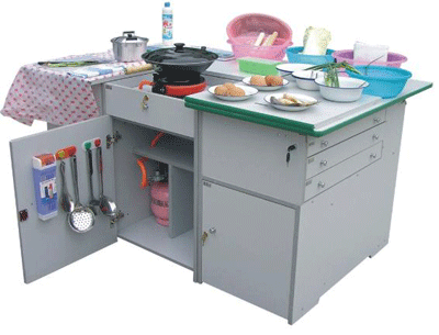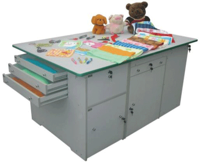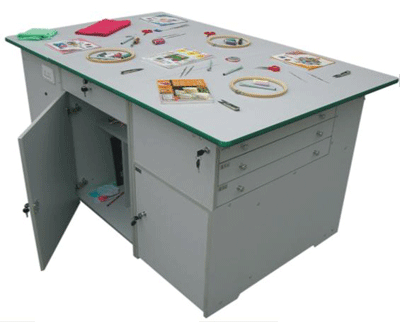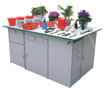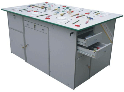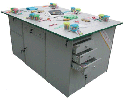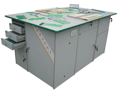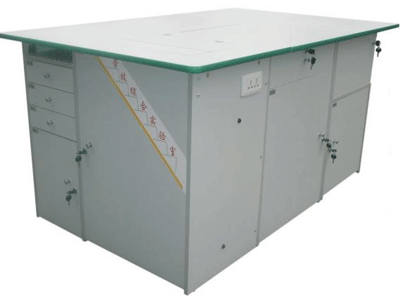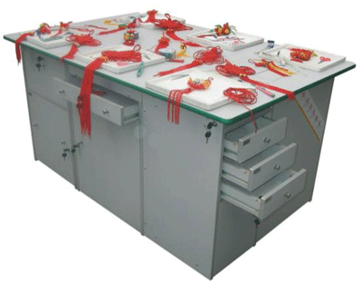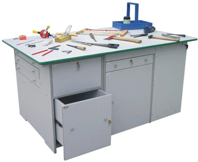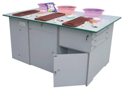 功能:桌體材料選用16mm厚優(yōu)質(zhì)雙貼面三聚氰胺板和30mm×30mm角鋼組成,桌體板截面選用優(yōu)質(zhì)PVC封邊經(jīng)全自動封邊機加溫180攝氏度膠封。桌面材料選用(A型)18mm厚優(yōu)質(zhì)雙貼面三聚氰胺板或(B型)25mm后成型防火貼面密度板,桌面板截面選用綠色T型PVC封邊槽封。桌體設(shè)計由三獨立單元組合在一起,例如金工、木工、洗滌為A獨立單元,烹飪、電工與電子為B獨立單元,縫紉與裁剪、手工工藝為C獨立單元。如果A獨立單元或B獨立單元單獨操作時,桌面可翻轉(zhuǎn)自如,而且各獨立單元的配備都儲放在各自獨立單元桌體里面。