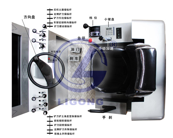 3.擁有腳踏、操縱箱、方向機、檔位控制器、油門踏板、松土器、手剎、轉向燈、高集成數據電路板及各種功能調節組件等組成,操作時在視屏上顯示輸出與操作相對應的逼真三維場景并伴有相應語音提示;
