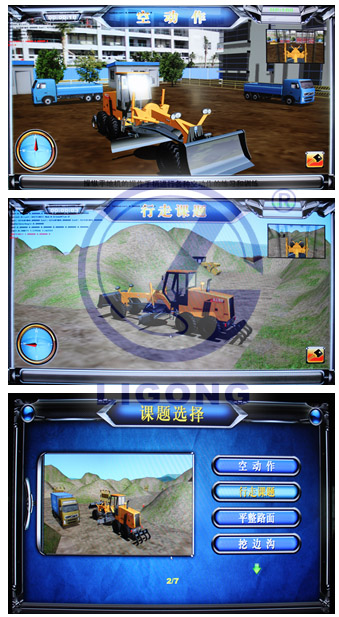 7.基礎訓練模式:平地機模擬機可滿足設備基礎規范操作的要求,可實現各種轉向、行走、鏟刀運動、松土平整、鏟斗運動以及施工作業的逼真模擬。